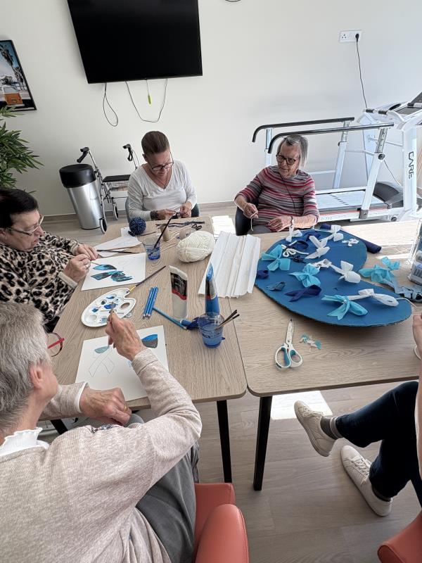 Entre ateliers manuels, activités collectives et moments de convivialité, chacun a pu trouver sa place et participer selon ses envies. Ensemble, ils ont confectionné de magnifiques rubans bleus, symbole de bienveillance et d’unité, que nous avons ensuite rassemblés dans un grand cœur décoratif — une belle représentation de l’esprit de la résidence : partage, respect et chaleur humaine.